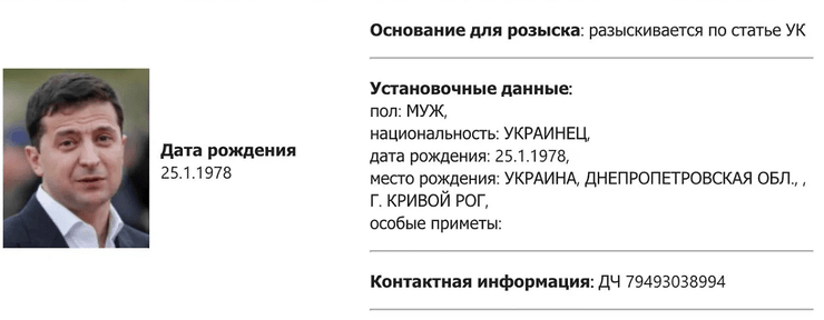 "Володимир Олександрович Зеленський, 25.1.1978. Розшукується за статтею КК", — ідеться в повідомленні МВС.