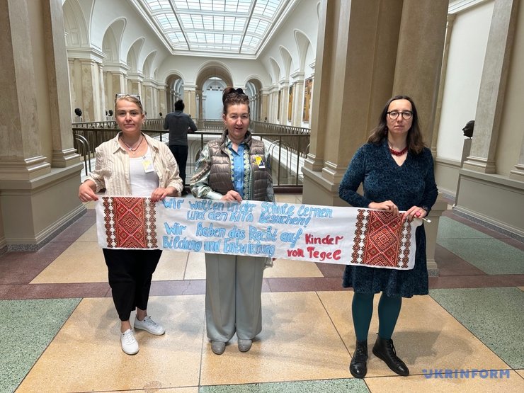 Зі свого боку, українські активісти прийшли на захід із плакатами "Чи хотіли б ви, щоби ваша дитина жила в "Тегелі"?"