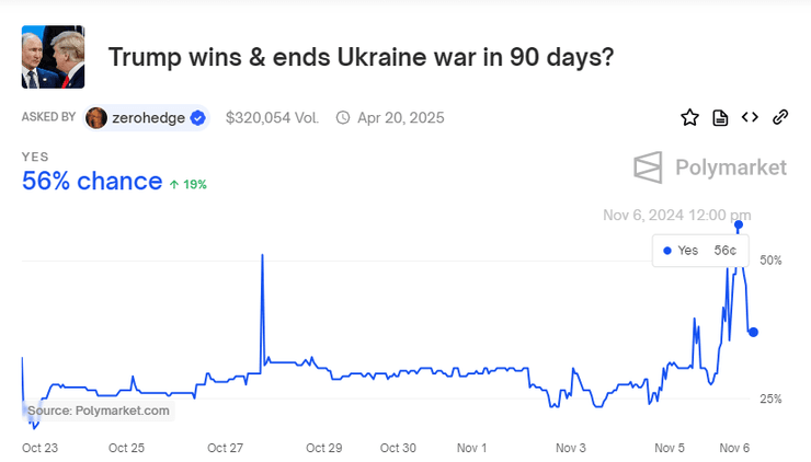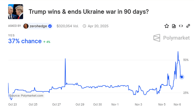 Сервіс Polymarket, який дає змогу користувачам зробити ставки на різноманітні події, приймає парі на те, що новообраний 47-ий президент США Дональд Трамп, інавгурація якого відбудеться 20 січня 2025 року, здатен припинити війну в Україні. Причому, добитися миру він має за 90 днів.