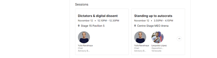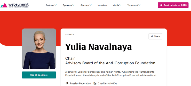 Голова Консультативної ради Фонду боротьби з корупцією Юлія Навальна мала виступити на двох панелях технологічної конференції під назвами "Диктатори та цифрове інакомислення" та "Протистояння автократам".