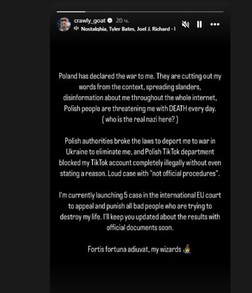"Поляки щодня погрожують мені смертю. (Хто тут справжній нацист?) Польська влада порушила закон, депортувавши мене, щоб відправити на війну. Моя сторінка в TikTok заблокована незаконно, без пояснення причин. Тепер я подаю 5 позовів до міжнародного суду ЄС, щоб досягти справедливості та покарати тих, хто зруйнував моє життя", – написав Crawly.