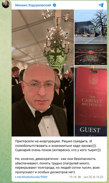 "Запросили на інавгурацію. Вирішив з'їздити. І поцікавитися, і знайомитися треба заново", — написав ексголова колишньої російської нафтової компанії "Юкос" Михайло Ходорковський.
