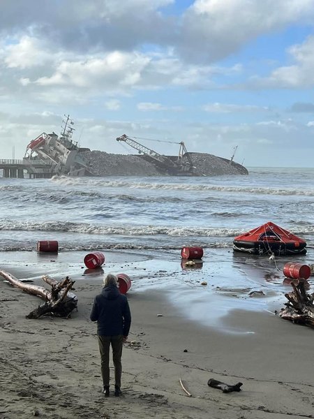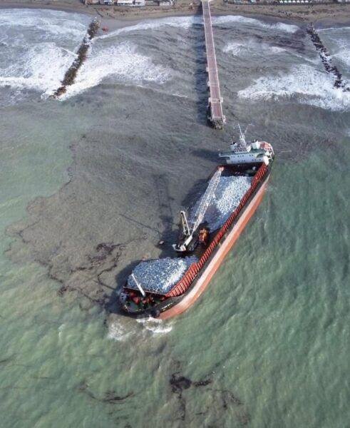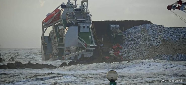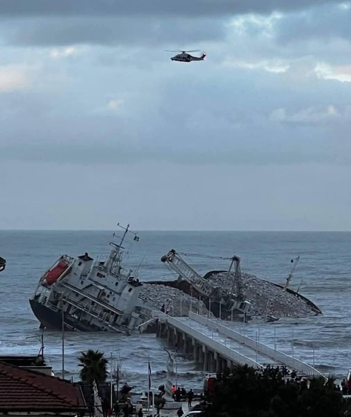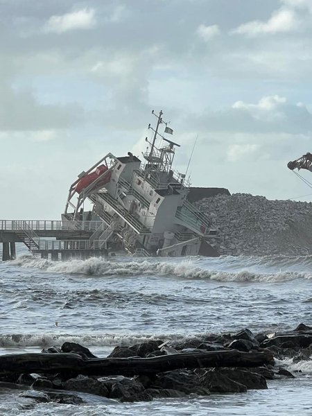 Як зазначається, сильні хвилі розвернули 103-метрове судно, корма корабля врізалася в пірс і частково його зруйнувала.