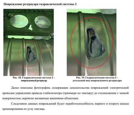 У районі кіля і стабілізатора фахівці знайшли багато сторонніх предметів, частина ушкоджень були чіткої прямокутної форми і схожі з вражаючими елементами ракети ППО.