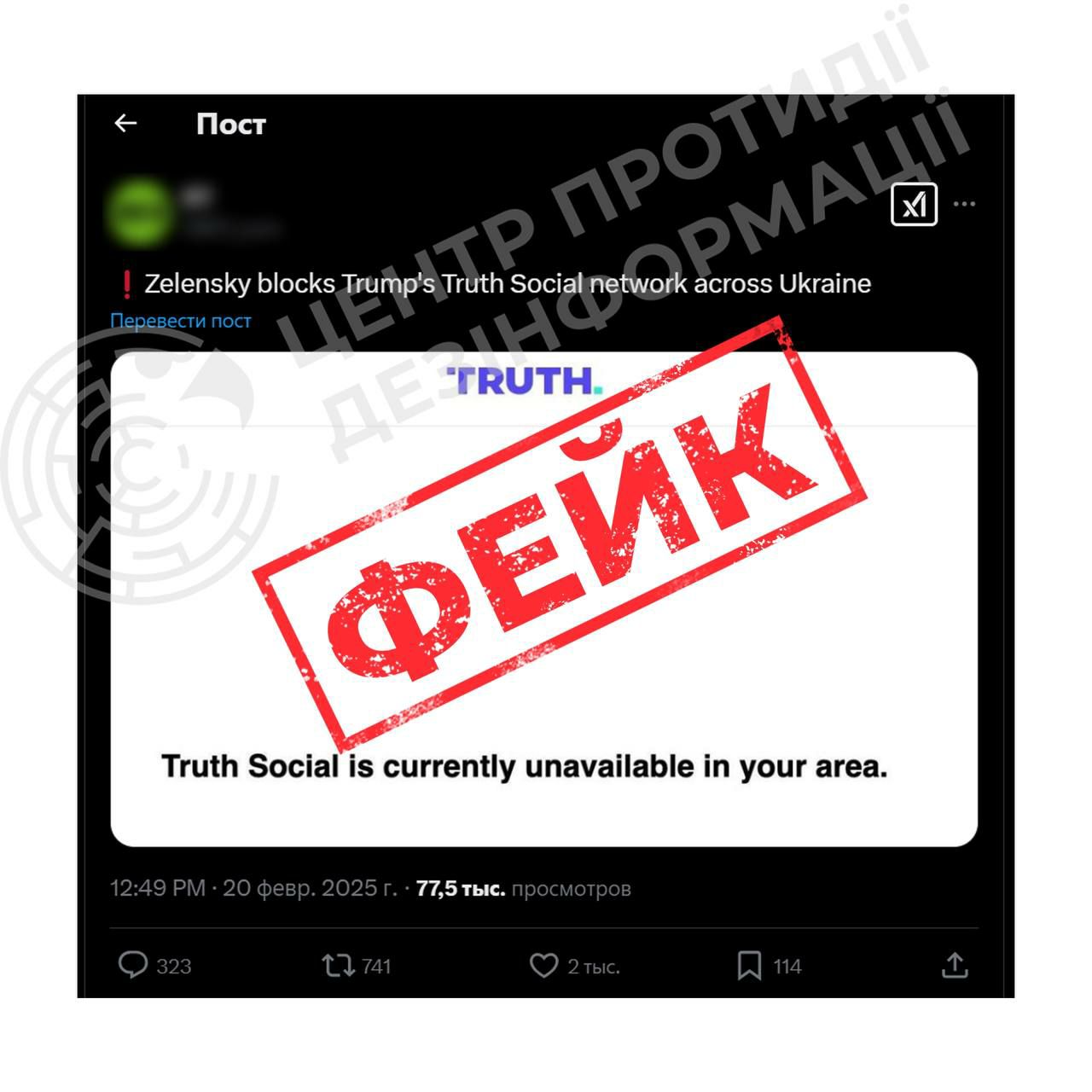 "Інформація російської пропаганди про те, що Президент Володимир Зеленський нібито заблокував соціальну мережу Truth Social в Україні, є фейком", — написали у відомстві.
