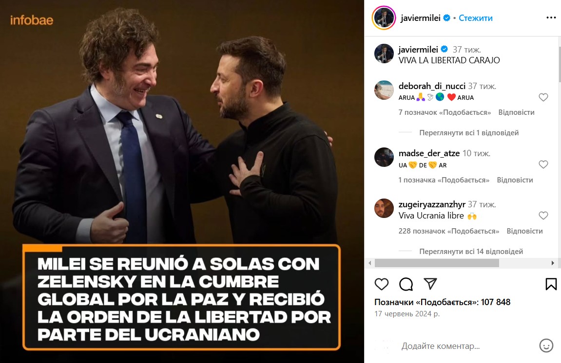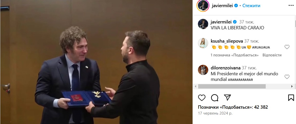 Крім того, деякі фото із Зеленським досі є в акаунті Мілея в Instagram. Фото — від червня 2024 року, під час візиту до Києва: одне — з подарунком, друге — під час щирого спілкування.