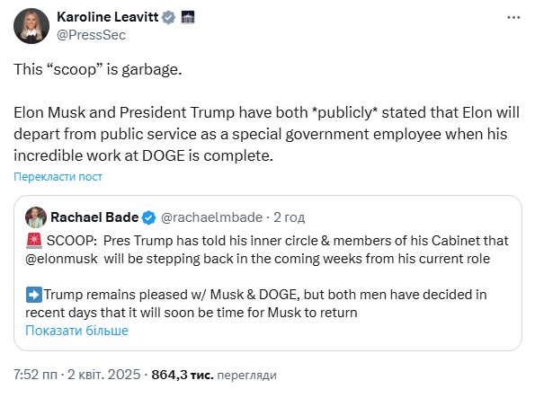 "Ця "сенсація" — нісенітниця. Ілон Маск і президент Трамп обидва публічно заявили, що Ілон піде з державної служби як спеціальний державний службовець, коли його неймовірну роботу в DOGE буде завершено", — написала Лівітт, процитувавши пост Рейчел Бейд, шеф-редактора видання POLITICO.