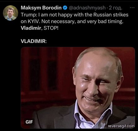 Користувачі мережі уявили реакцію самого Путіна на таке звернення. Лідер країни-терористки начебто насміхається зі спроб Трампа закінчити війну.