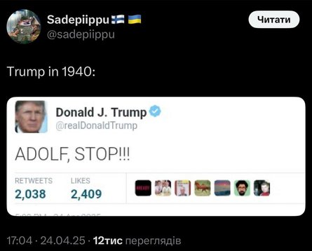 Попри складні часи, обстріли та втрати, українці зберігають почуття гумору та традиційно відреагували мемами на звернення президента США Дональда Трампа до російського колеги Володимира Путіна. Американський лідер попросив президента РФ "зупинитися" та укласти мирну угоду після масованого обстрілу України 24 квітня.