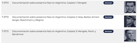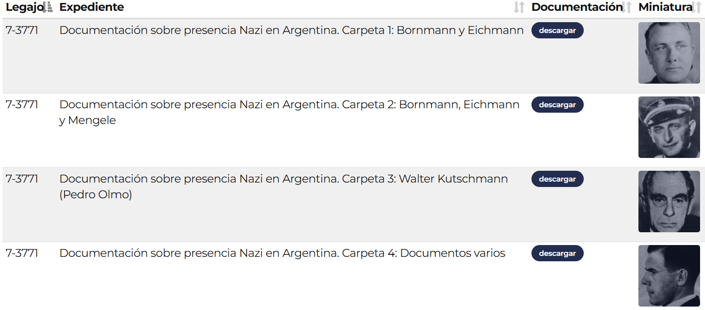 В архіві Аргентини доступні 1850 документів про нацистів, серед яких особисті справи, газетні вирізки, перебіг розслідування справи, довідки та інше. Документи надійшли до Головного архіву Аргентини країни 1992 року.