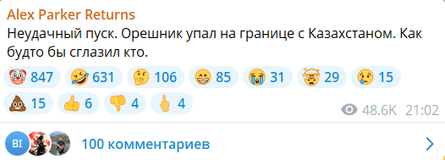 Один із російських пропагандистів стверджує, що росіяни здійснили пуск міжконтинентальної ракети "Орешник", але він виявився невдалим. За його версією, "Орешник" впав на кордоні з Казахстаном