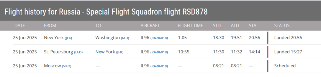 Літак Іл-96 з бортовим номером RA-96022 25 червня здійснив переліт з Санкт-Петербурга до Нью-Йорка, а звідти — до столиці США Вашингтона. Борт належить до спеціального льотного загону "Росія", що надає літаки для перевезення високопоставлених російських посадовців. Однак ані російська, ані американська сторона не повідомляли про офіційні візити.