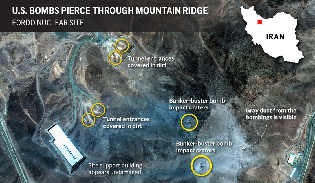 Супутникові знімки Фордо після бомбардування в неділю показують входи в тунелі, мабуть, засипані землею, і отвори, які можуть бути точками входу для 30 000-фунтових високоточних протибункерних ракет США. Під'їзні шляхи також виглядають пошкодженими.