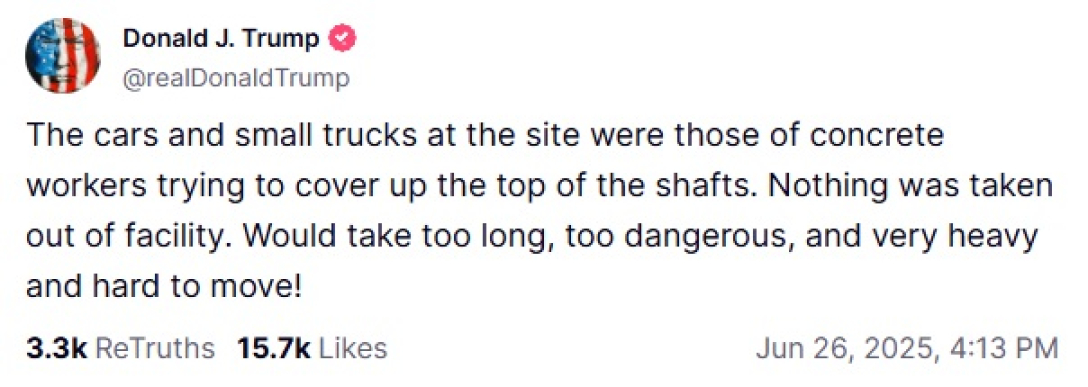 Явно посилаючись на Фордо, Трамп написав на своїй платформі Truth Social у четвер: "Нічого не було вивезено з об'єкта. Це зайняло б занадто багато часу, було б занадто небезпечно, і було б дуже важко переміщати!"