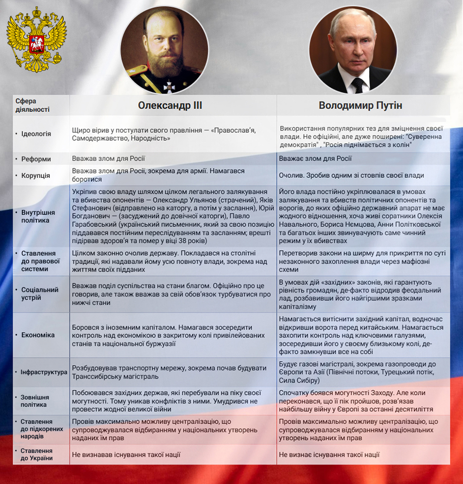 Консерватизм, захист інтересів прогнилих еліт коштом більшості населення, фасадна модернізація та шовінізм – ось речі, які об’єднують Олександра III та Володимира Путіна. Проте схоже, що на відміну від сучасного російського самодержця, Олександр III не був лицеміром і реально усвідомлював справжню силу своєї держави. Тому зміг оберегти її від воєн, розуміючи, яку біду вони можуть принести. Путін цю деталь біографії Олександра Третього, мабуть, у пiдручнику проґавив.
