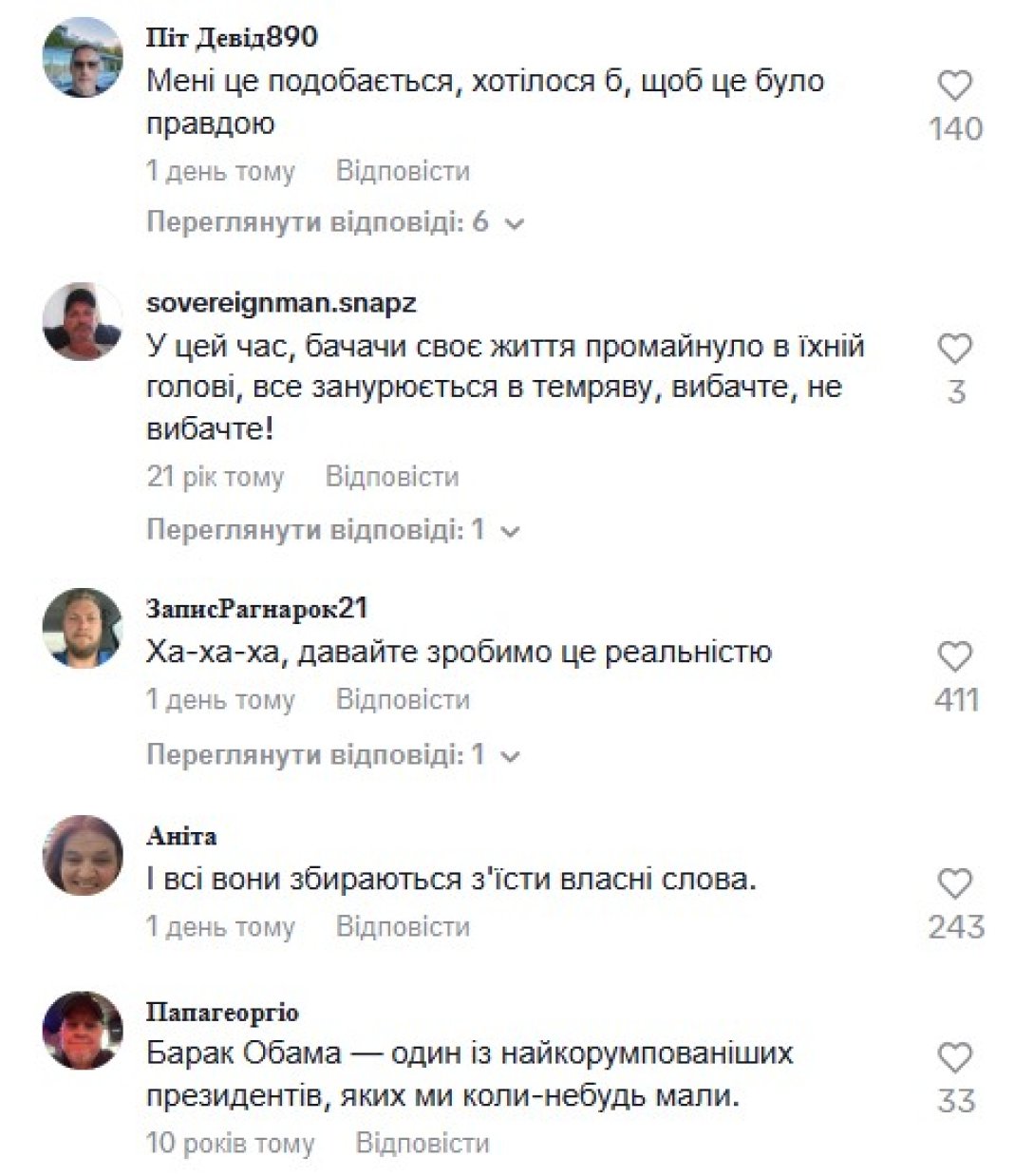 Під відео в TikTok протягом з'явилось понад 44 тис. коментарів. Найбільше схвалення отримали дописи, в яких критикують Обаму та стверджують, що за його часів демократи були "найкорумпованішими" і тому їх потрібно за це покарати.