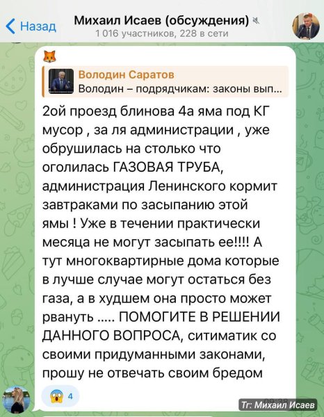 За інформацією ще одного саратовського каналу, мешканці багатоповерхівки, що вибухнула, скаржилися в тг-каналі мера Саратова на аварійну трубу ще за дві години до вибуху. Як зазначають місцеві, на неї ніхто не звертав уваги.