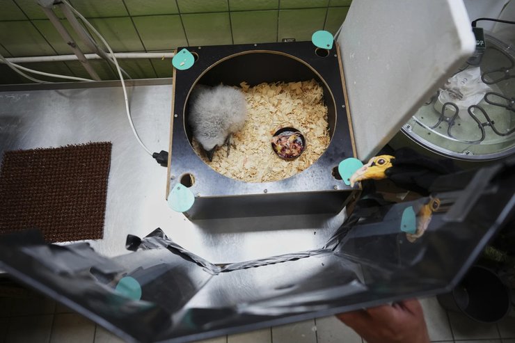 Пташеня вилупилося 3 тижні тому, але батьки від нього відмовилися. Щоб врятувати йому життя і не приручити, працівники зоопарку почали використовувати ляльку на руку у формі птаха.