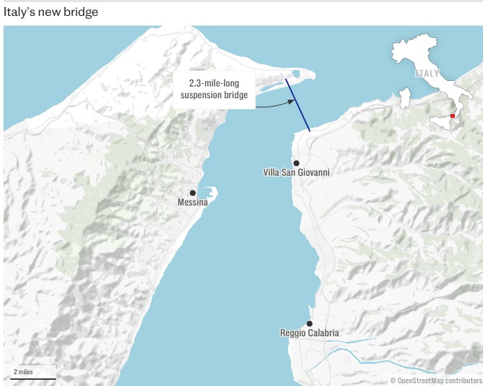 Уряд Італії дав остаточне схвалення проєкту вартістю 13,5 мільярда євро з будівництва найбільшого у світі підвісного мосту, який з'єднає Сицилію з материком через Мессинську протоку. У різний час цій ідеї заважали землетруси, мафія і брак технологій, пише Telegraph.