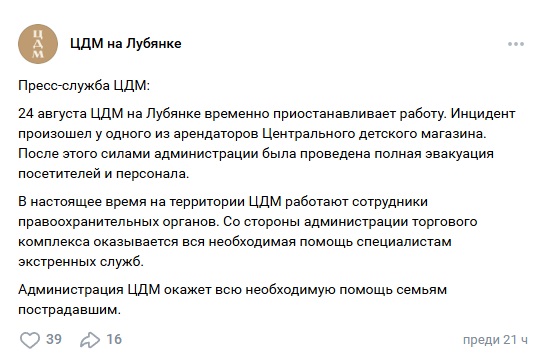 РосЗМІ про вибух на Луб'янці повідомили стандартно: відвідувачі та співробітники Центрального дитячого магазину, який до 2015 року мав назву центральний універмаг "Детский мир", були евакуйовані ще до прибуття пожежників. У пресслужбі столичного главку МНС РФ повідомили, що евакуаційні заходи організувала адміністрація торгового центру. На місце прибуло до 10 карет швидкої допомоги та саперне відділення.