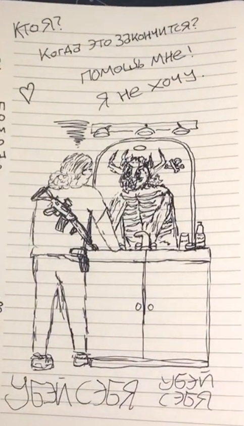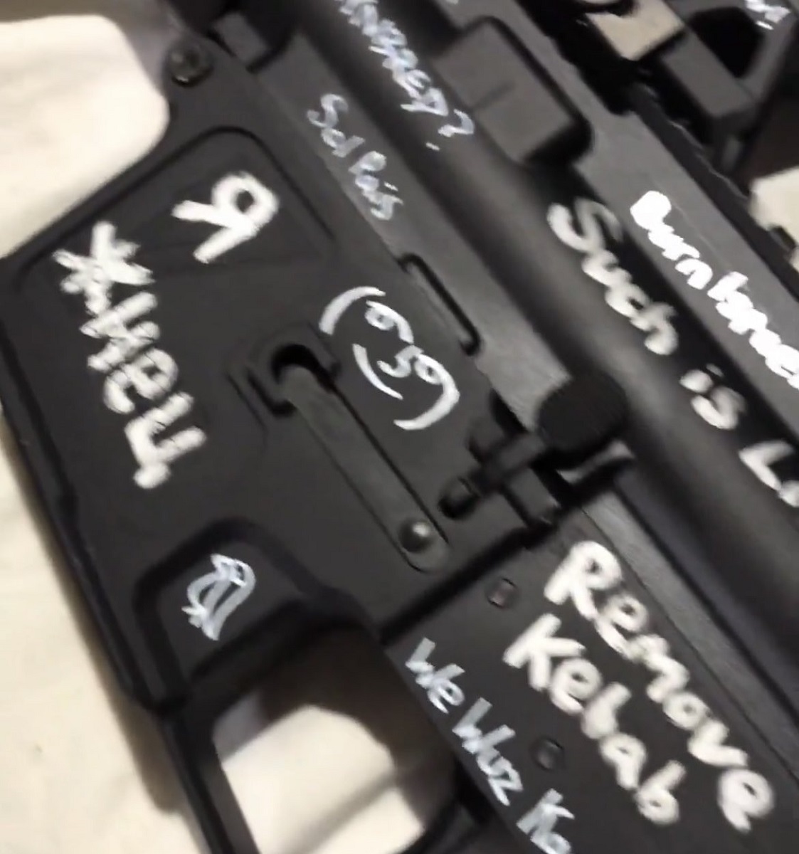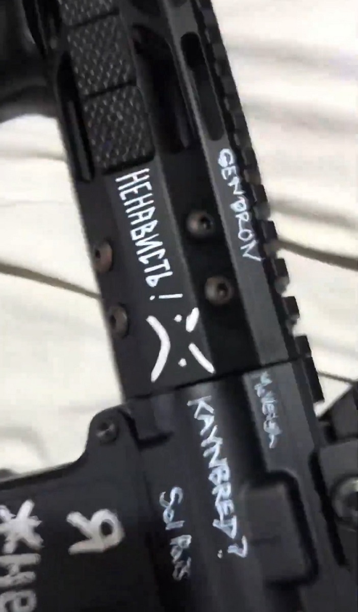 Також він покрив свою зброю і магазини написами російською, як-от "Горілка і РЕБ", "ненависть", "убий себе". Також він позував із нашивкою "ФСБ".