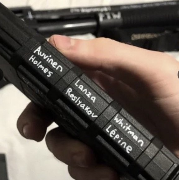 На одному з магазинів він написав імена сумнозвісних шкільних стрільців, серед яких опинився і Владислав Росляков, який 2018 року розстріляв студентів у Керченському технологічному коледжі. Тоді загинула 21 людина. А також Адам Ленза, який застрелив 26 осіб, зокрема 20 дітей, у початковій школі "Сенді Хук" у Коннектикуті 2012 року.