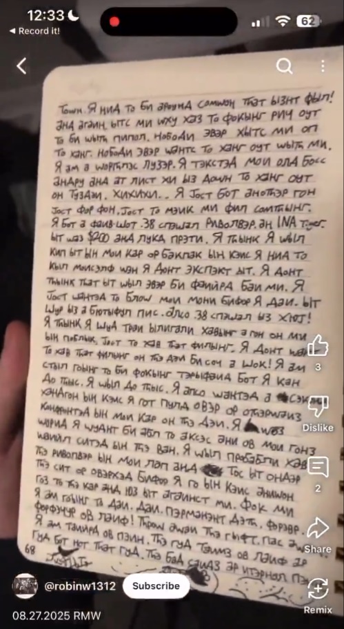 Уже провели чотири обшуки і виявили щоденники стрілка, а також численні пости в соцмережах. Виявилося, що щоденники Робін Вестман вів кирилицею, а у відеороликах часто говорив російською.