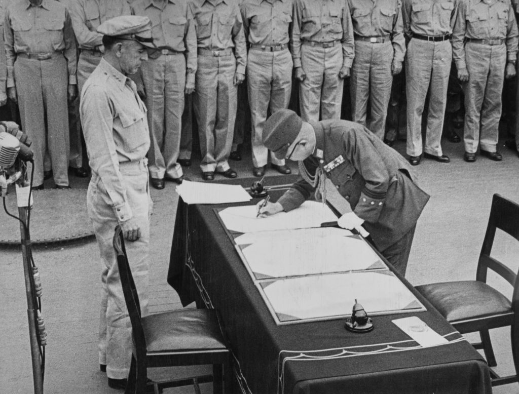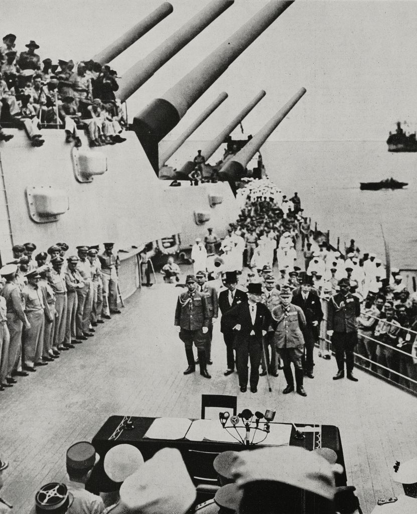 2 вересня 1945 року на американському військовому лінкорі «Міссурі» відбулася церемонія капітуляції Японії перед арміями союзників. Японську делегацію очолив міністр закордонних справ Мамору Сігеміцу та представник генштабу Йосідзіро Умедзу. Генерал Умедзу погодився прибути лише після наполягання імператора Хірохіто. Після п’яти хвилин ганьби японська делегація підписала капітуляцію. Її прийняв командувач американськими військами генерал Макартур, представник СРСР українець генерал Кузьма Дерев'янко, представники Великої Британії, Китаю, Нідерландів, Австралії, Канади, Франції та Нової Зеландії.