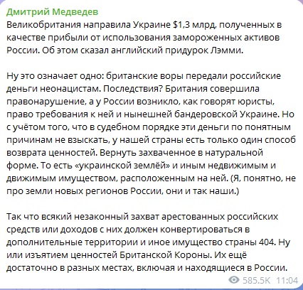 Дмитро Медведєв, який зараз обіймає посаду заступника Путіна в Раді Безпеки Російської Федерації, вибухнув новим постом, який цього разу опублікував у Telegram-каналі. Обурило Дмитра, що Велика Британія направила Україні 1,3 мільярда доларів, отриманих як прибуток від використання заморожених активів Росії.