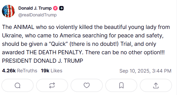 У своєму дописі у соцмережі Truth Social президент США назвав Брауна «твариною, що жорстоко вбила прекрасну молоду дівчину з України, котра приїхала до Америки в пошуках миру і безпеки».