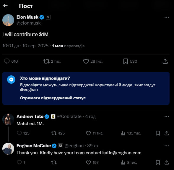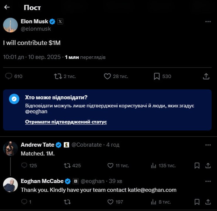 "Я пропоную 500 тисяч доларів у вигляді грантів по 10 тисяч доларів на розпис стінописів із зображенням Ірини Заруцької у відомих місцях міст США. Будь ласка, зв’яжіться для отримання додаткової інформації, також поділіться цим повідомленням", — написав Маккейб.