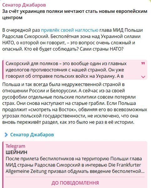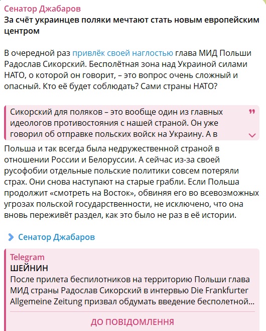 Перший заступник голови Комітету Ради Федерації з міжнародних справ пригрозив Польщі агресією і новим розділом, про що написав у себе в Telegram-каналі.