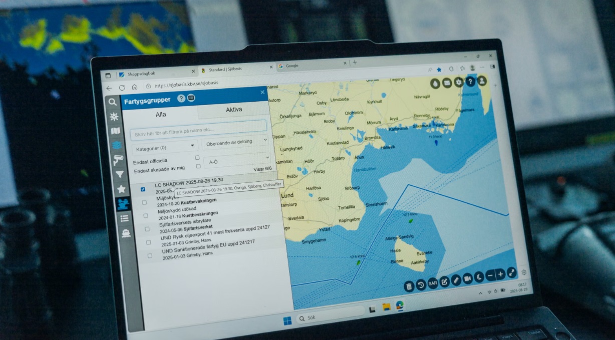 Пізніше берегова охорона слідує за одним, нафтовим танкером, який наразі плаває під прапором Мальти, який, згідно з морськими онлайн-записами, в останні два роки також плавав під прапором Маршаллових Островів під іншою назвою. Поки судна перебувають в економічній зоні країни, а не в її меншому територіальному морі — не більше ніж 12 морських миль від берега — підстави для втручання вкрай обмежені, але з липня берегова охорона має право зв'язуватися із судном, щоб запросити інформацію про судно і його страховку. Член екіпажу нафтового танкера повідомляє по радіо, що його останнім портом заходу був Приморськ, Росія, і він перевозить трохи менше ніж 30 000 метричних тонн дизельного палива. Його наступна зупинка, за його словами, — Аліага в Туреччині. Його кінцевий пункт призначення дізнатися неможливо, але шведська берегова охорона впевнена, що це судно є частиною російського тіньового флоту.