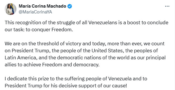 "Я присвячую цю премію стражденному народу Венесуели та президенту Трампу за його рішучу підтримку нашої справи!" — написала Мачадо.