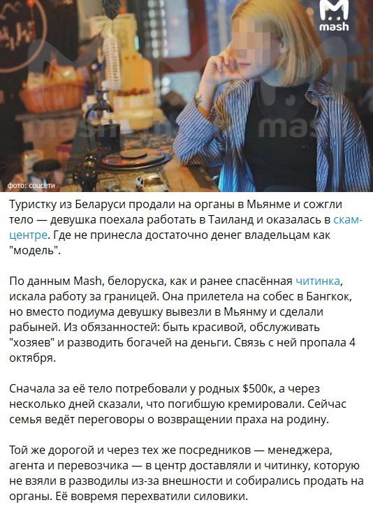 Уродженка Мінська та учасниця шоу "Голос" Віра К., якій було 27 років, поїхала до Таїланду працювати моделлю, де й зникла. Через кілька днів з'явилася інформація, що її продали на органи, а тіло кремували.