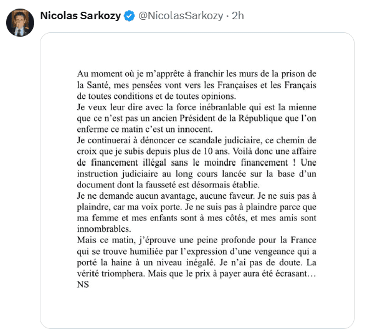 Після приїзду до в'язниці, Саркозі написав у Х: