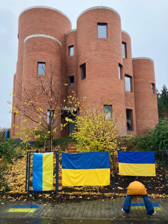 Прапори України на паркані та намальовані фарбою на прилеглій території з'явилися біля будинку спікера Палати депутатів Чеської Республіки Томіо Окамури на вулиці Над Тейнкой у празькому районі Бржевнов.