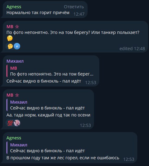 При цьому місцеві жителі в пабліках припускають, що це може бути лісова пожежа, хоча на фото чітко видно, що палає велике судно посеред затоки біля Владивостока, що стоїть на якорі. Оскільки в соцмережах з'явилися знімки, зроблені як удень, так і вночі, можна припустити, що пожежа триває вже близько доби.
