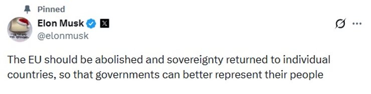 "ЄС має бути скасовано, а суверенітет повернуто окремим країнам, щоб уряди могли краще представляти свій народ", — написав він.