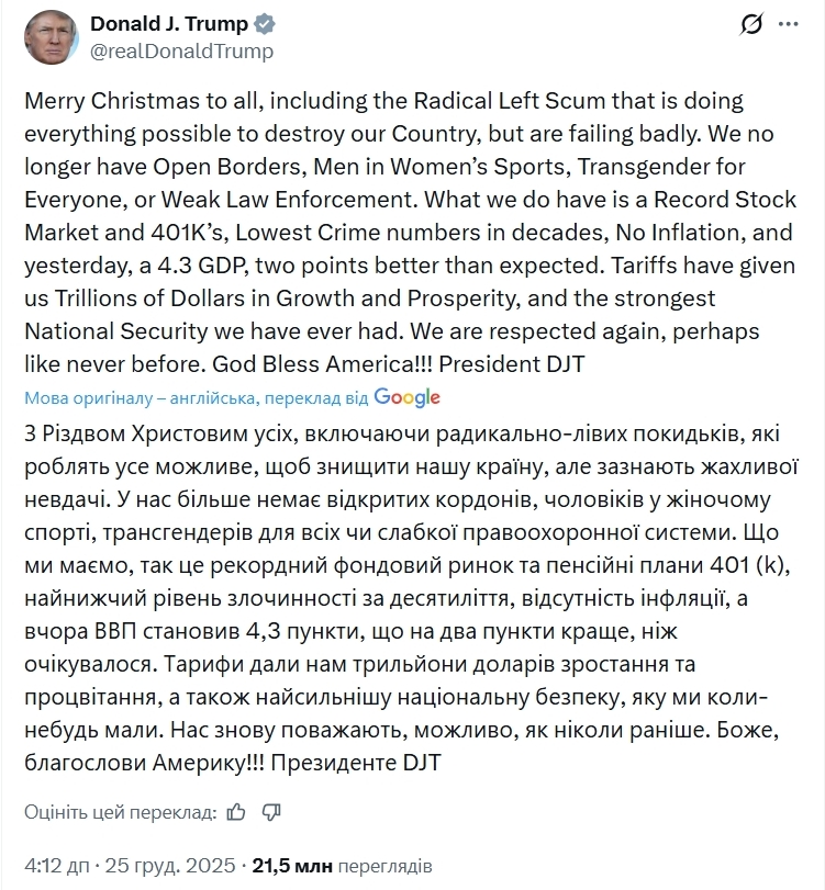 Також Дональд Трамп на своїй сторінці в Х опублікував оригінальне вітання із Різдвом для всіх і навіть "радикально-лівих покидьків", які нібито намагаються "знищити" США.