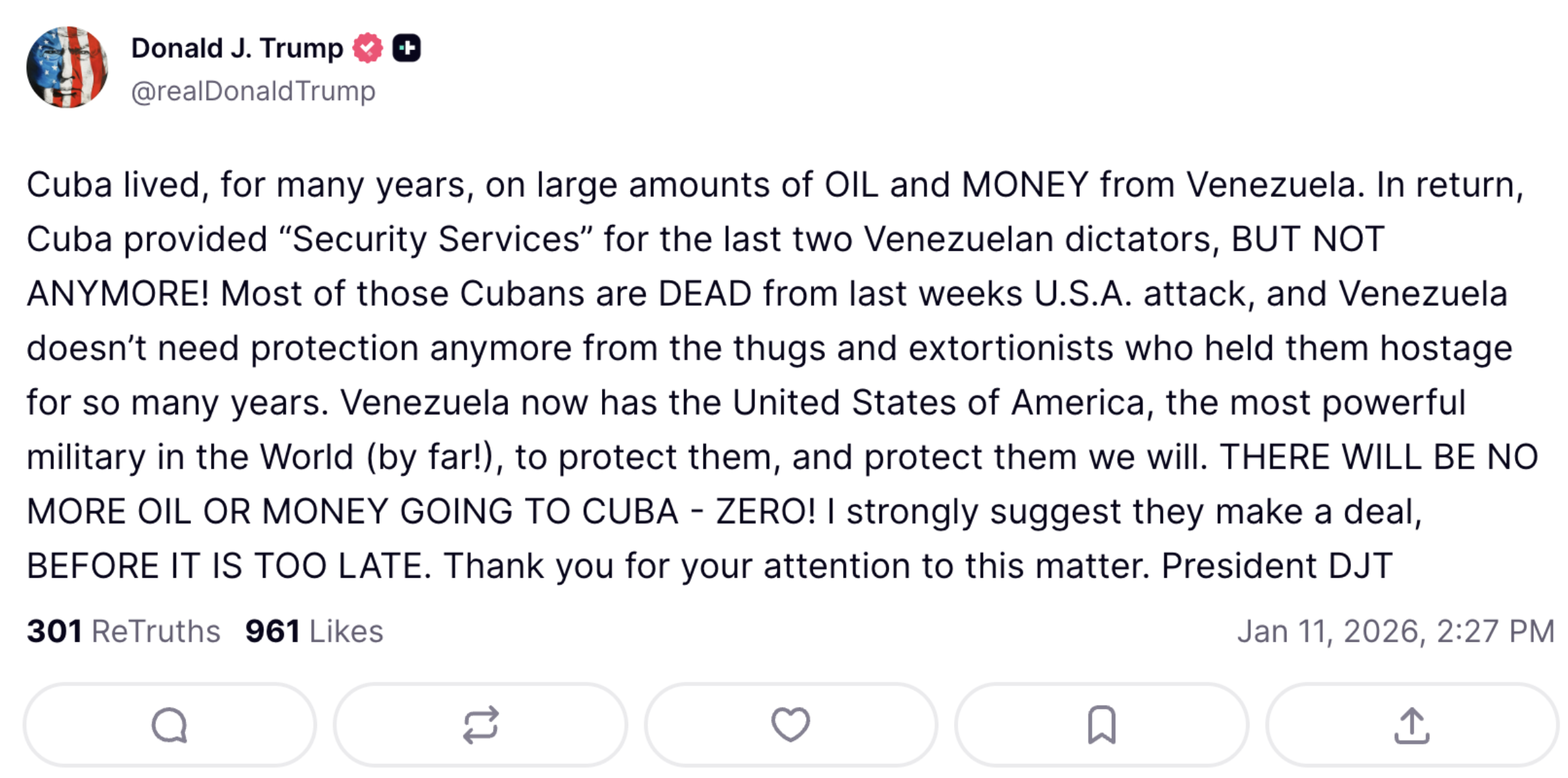 Глава Білого дому заявив, що Куба багато років жила за рахунок нафти і грошей з Венесуели, надаючи натомість послуги з безпеки венесуельським диктаторам. Однак тепер, за словами Трампа, Венесуела не потребує таких послуг з боку "бандитів і здирників", оскільки країну захищатиме американська армія. Відповідну заяву Трамп опублікував на своїй сторінці в соціальній мережі Truth Social.