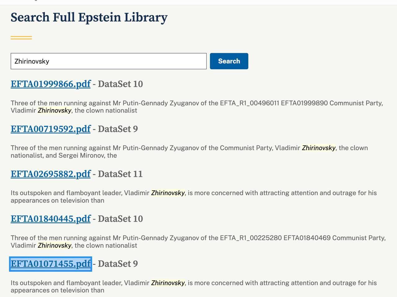 Міністерство юстиції США представило громадськості тисячі файлів, пов'язаних зі скандальним фінансистом Джеффрі Епштейном. Там знайшлося і прізвище екс-глави ЛДПР Володимира Жириновського.