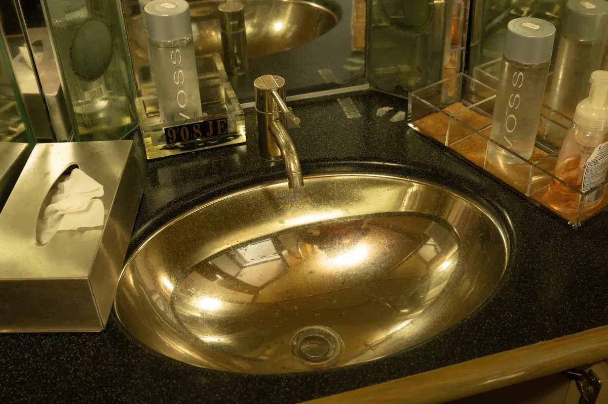 Одразу за входом, ліворуч, розташована елегантна ванна кімната, де були знайдені дитячі товари. За кілька кроків попереду розташована єдина спальня в літаку, де над головою висіли три протигази, а на великому матраці акуратно лежала біла ковдра.
