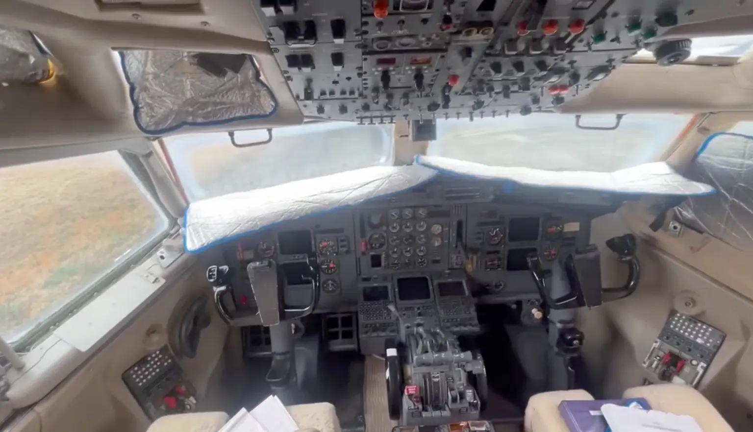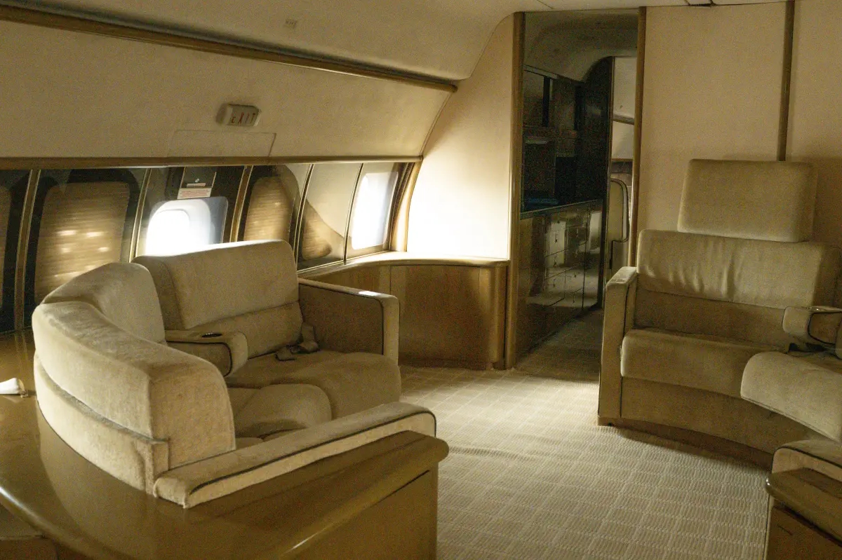 Зараз у салоні літака валяються порожні пляшки з-під води, банки з-під розчинної кави та інші предмети повсякденного вжитку, а шафи, картотеки і ящики забиті книжками й папками з посібниками з експлуатації та іншими авіаційними документами. Усередині кабіни пілотів у шухляді було виявлено чорний стаціонарний телефон, шнур якого було вирвано зі стіни.