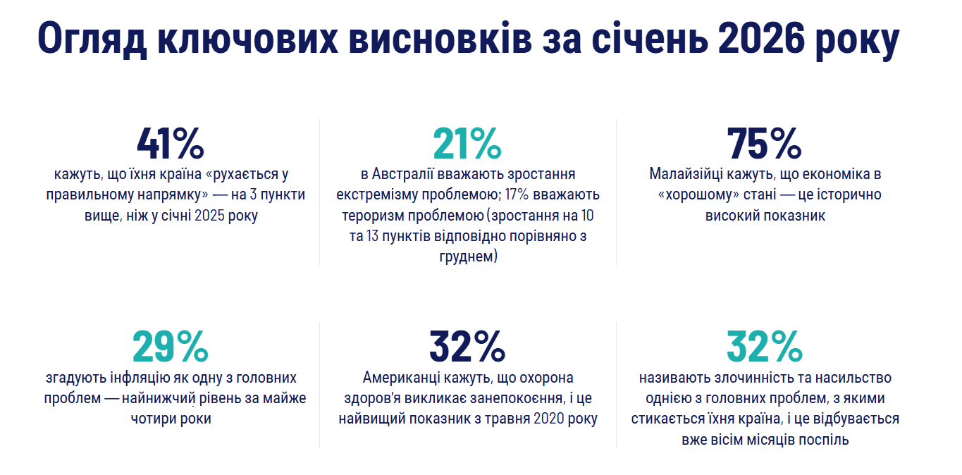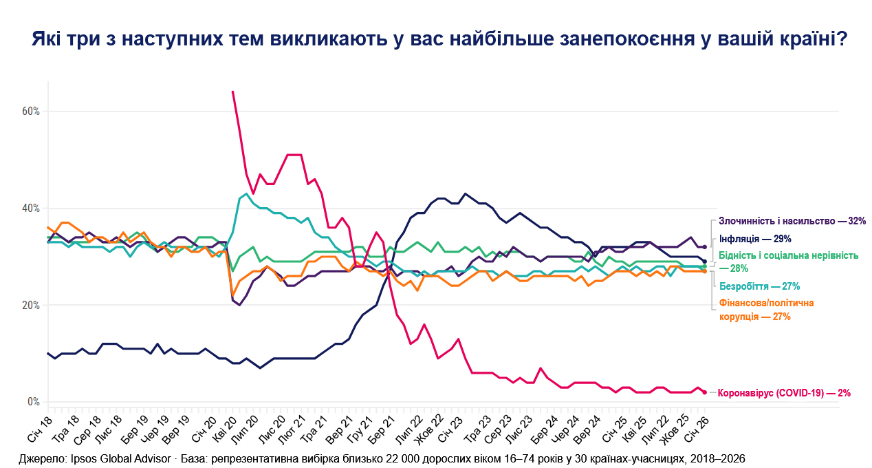 Одна із найбільших у світі міжнародних компаній, що спеціалізується на маркетингових дослідженнях — Ipsos — у січні 2026 року провела цікаве опитування. Фахівці компанії запитали у респондентів, що їх найбільше турбує у сучасному світі. Результати відповідей здивували усіх. Фокус розбирався, чим зараз найбільше переймаються жителі планети Земля.