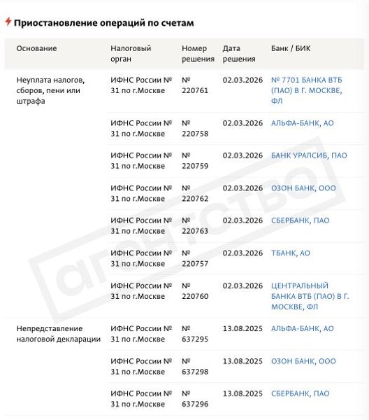 А 2 березня 2026 року податкова призупинила операції за рахунками в уже в шести банках: ВТБ (дві філії), Т-Банку, "Сбері", "Озон банку", "Уралсибі" та Альфа-банку. Причина — несплата податків, зборів, пені або штрафу.