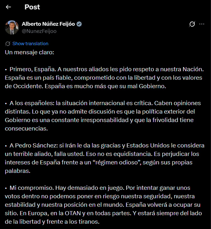 "Педро Санчесу: якщо Іран дякує вам, а Сполучені Штати вважають вас жахливим союзником, — ви зазнаєте поразки. Це не є рівновіддалення [у ситуації з Іраном]. Це шкодить інтересам Іспанії перед "ненависним режимом", як ви самі це називали", — підсумував політик.
