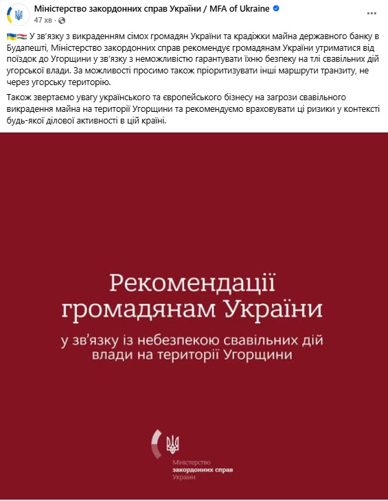 Ба більше, у зв'язку з останніми подіями та зростанням напруги між двома країнами, МЗС закликало громадян України утриматися від поїздок до Угорщини через неможливість "забезпечити безпеку на тлі свавільних дій угорської влади".