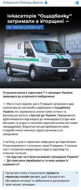 На захоплення інкасаторів одразу ж відреагував глава МЗС Андрій Сибіга. У своєму повідомленні на Х він назвав дії Угорщини "державним тероризмом і рекетом".