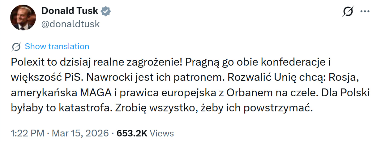 "Polexit" — це сьогодні реальна загроза! Його прагнуть обидві конфедерації та більшість членів партії "Право і справедливість". Навроцький є їхнім покровителем", — наголосив Туск.